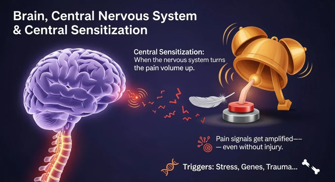 Many researchers believe fibromyalgia stems from overstimulation of the nervous system your brain and spinal cord basically turning the volume up on pain messages. This is called “central sensitization” a fancy phrase, but really, imagine your alarm being extra sensitive even to light taps.