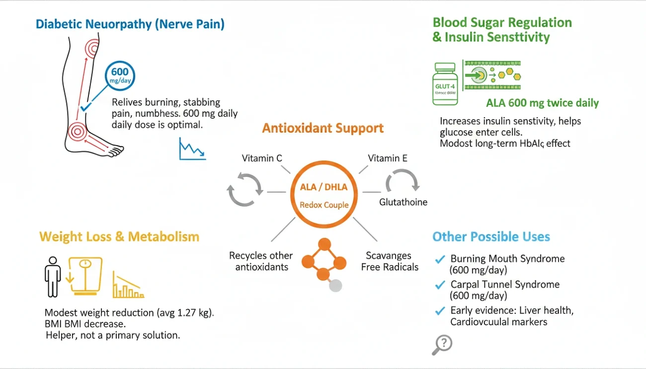 This is hands-down the most studied use of ALA. The SYDNEY 2 trial, titled “Oral Treatment With α-Lipoic Acid Improves Symptomatic Diabetic Polyneuropathy” (Diabetes Care, 2006), put oral ALA to the test in 181 diabetic patients across Russia and Israel. A daily dose of 600 mg eased the burning, stabbing pain, paresthesia, and numbness, and the researchers concluded that 600 mg/day hit the sweet spot between benefit and side effects.