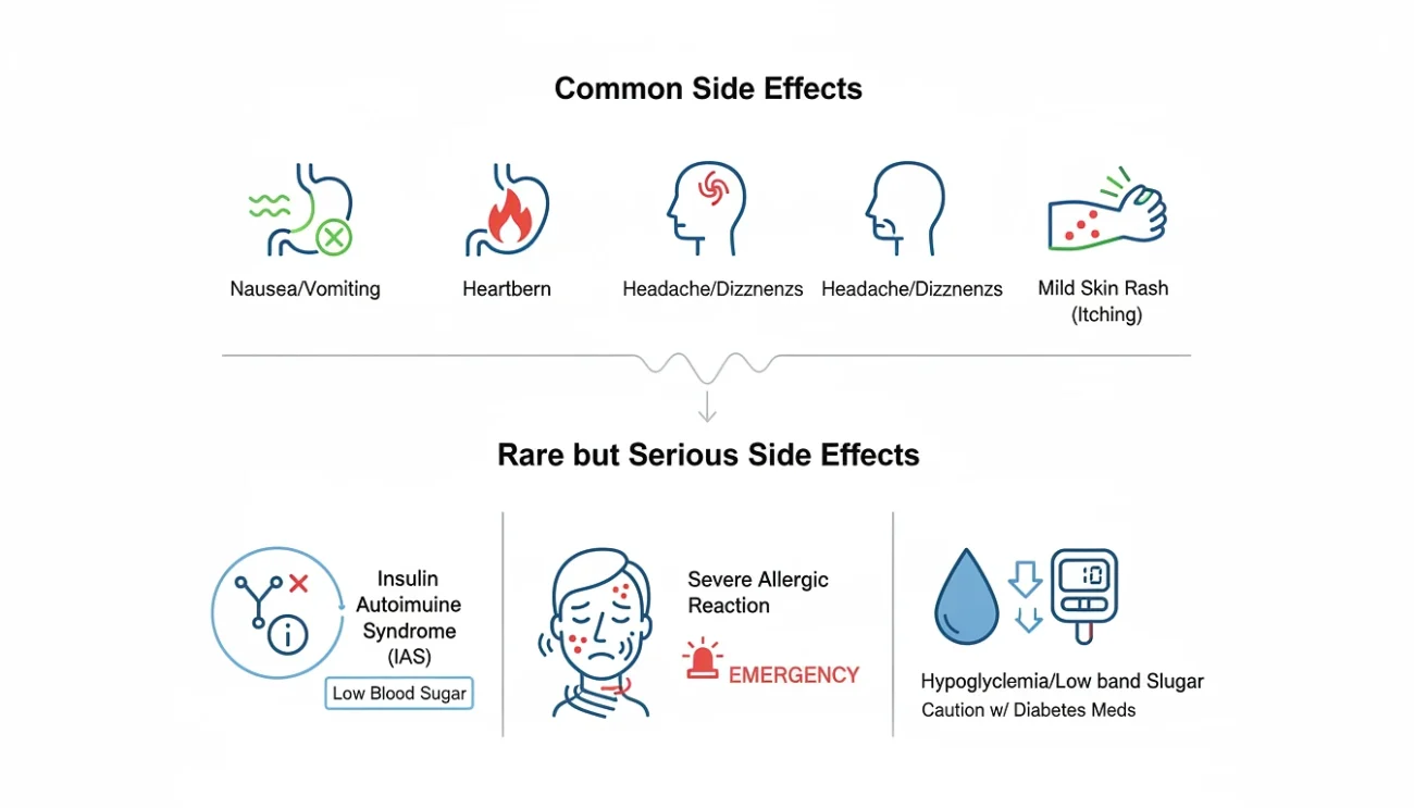 - Insulin Autoimmune Syndrome (IAS): Health Canada’s “Summary Safety Review – Alpha Lipoic Acid – Assessing the Potential Risk of Low Blood Sugar (Hypoglycemic Episodes)” found that in rare cases, ALA can trigger insulin autoimmune syndrome. That’s where your body produces antibodies against its own insulin, leading to recurrent low blood sugar episodes. The risk seems tied to a specific genetic variation, and symptoms cleared up once people stopped taking ALA.