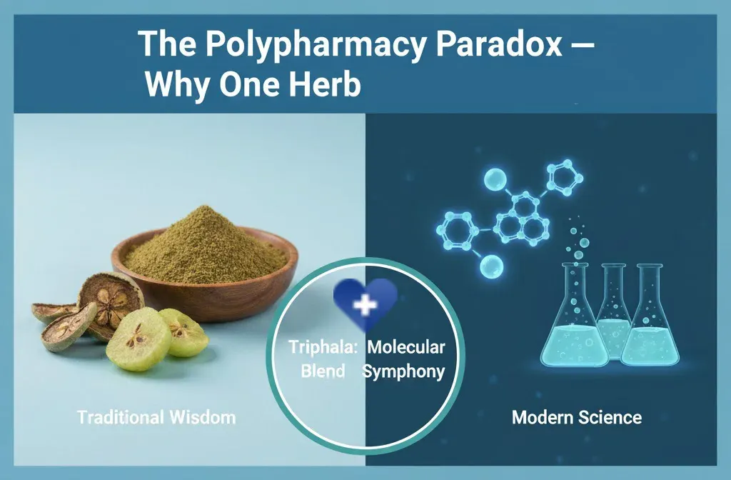 Triphala means “three fruits” Amalaki, Bibhitaki, Haritaki. Sounds simple until you realize each fruit contains tannins, flavonoids, glycosides, phenolic compounds, and alkaloids in varying concentrations.
