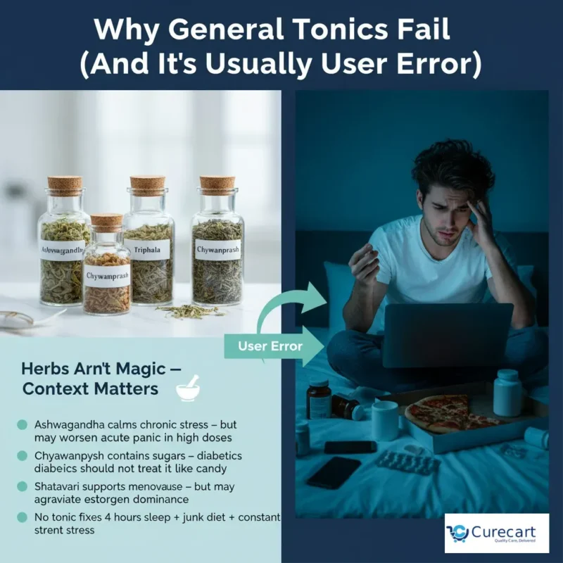 Expecting tonic results from tonic-unfriendly lifestyles. Sleep 4 hours, eat processed garbage, never move, chronically stressed, then wonder why Triphala isn’t transforming your health. No herb compensates for systematic self-destruction.