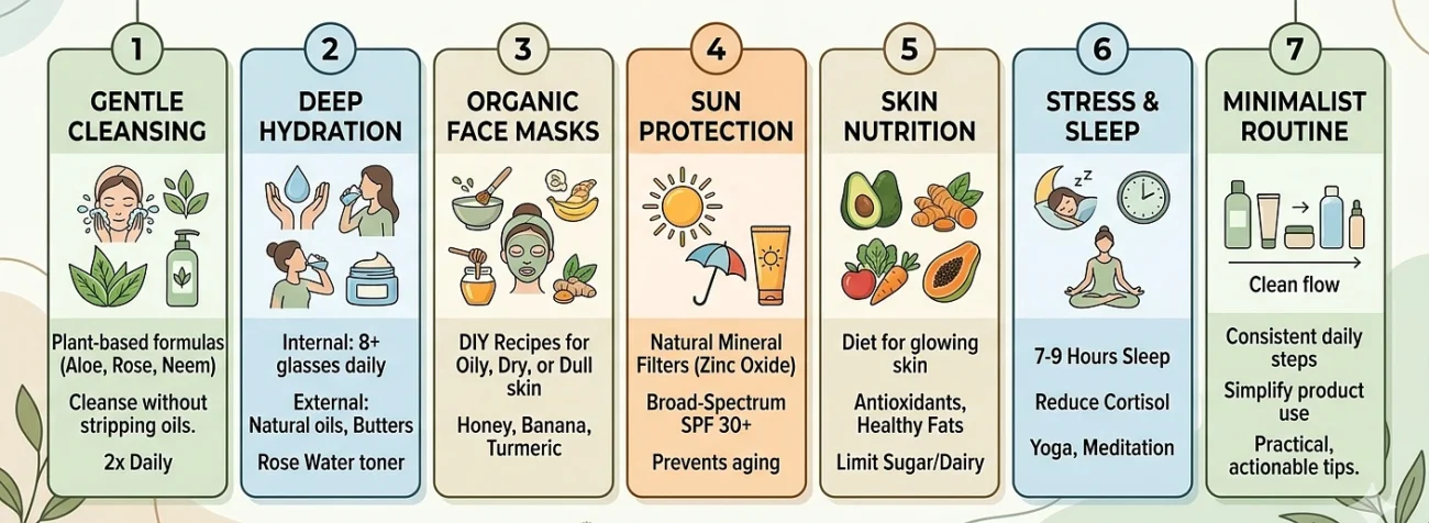 We cover seven essential beauty pillars: gentle cleansing, deep hydration, organic face masks, sun protection, nutrition for glowing skin, stress and sleep management, and a minimalist daily skincare routine. Each section is niche-specific, research-backed, and designed for all skin types.