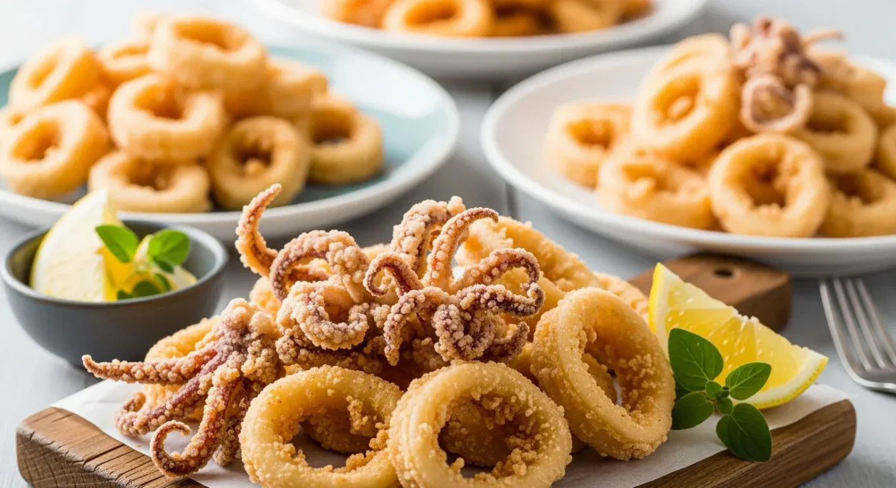 - Presentation: rings mixed with tentacles, garnished with fresh herbs or citrus; sometimes served on rustic or seaside style trays or plates.