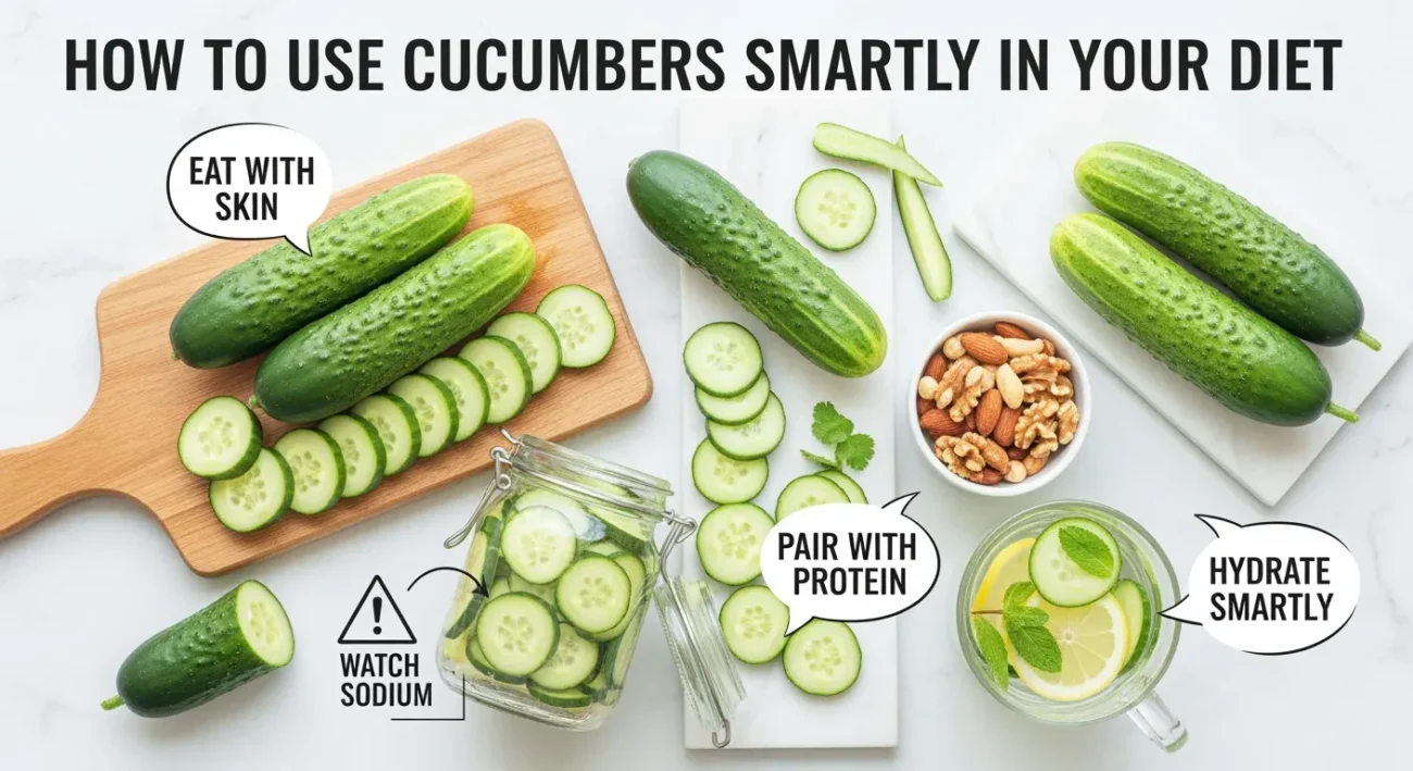 Because cucumber is low in protein and fat, pairing it with foods that supply those (nuts, yogurt, lean proteins, legumes) helps make a satisfying, balanced snack or meal.