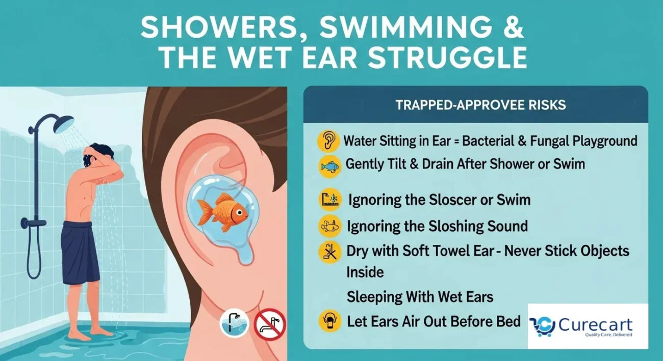 Water in your ears is fine water staying in your ears is not. If you finish swimming and your ear sounds like there’s a goldfish inside, you’ve got trapped moisture. That moisture can welcome fungal infections like it’s hosting Airbnb.
