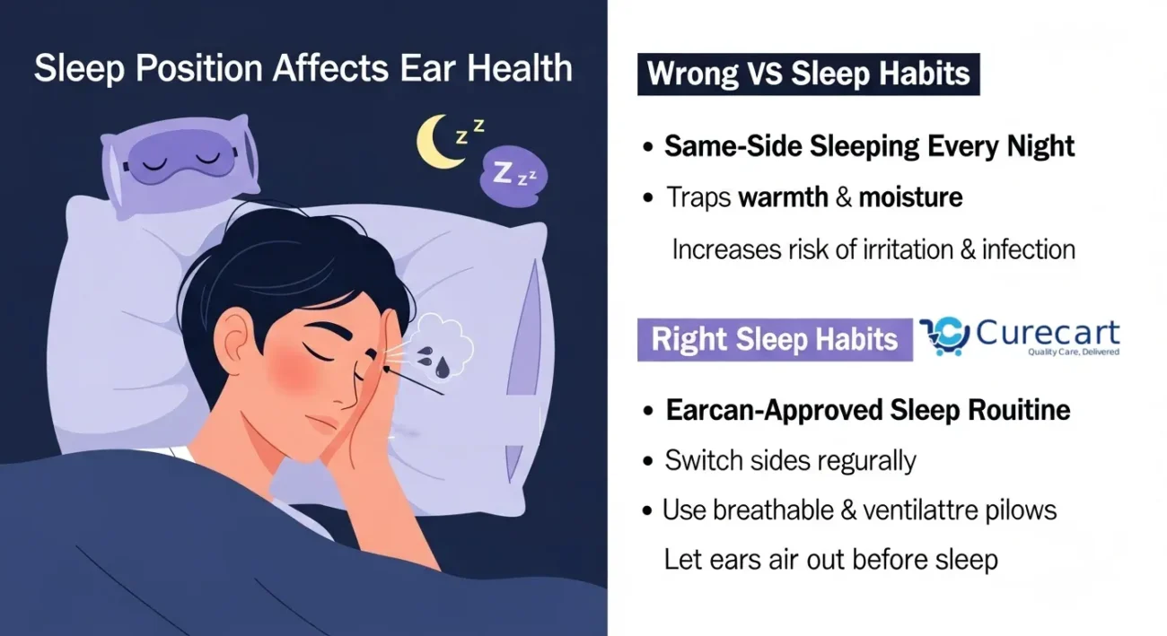 Side sleepers, listen up if you always sleep on the same side, that ear gets less airflow and more moisture buildup. Switch sides or use breathable pillows. Earcan approved rule: Let your ears breathe while you sleep.