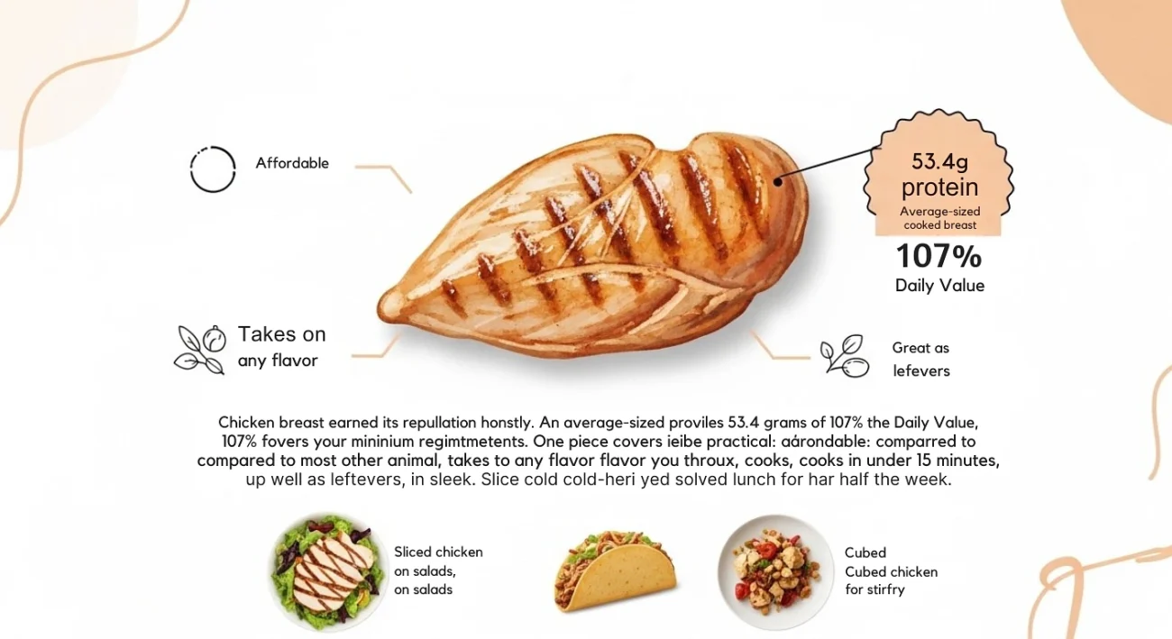 Chicken breast earned its reputation honestly. An average-sized cooked chicken breast provides 53.4 grams of protein, 107% of the daily value.