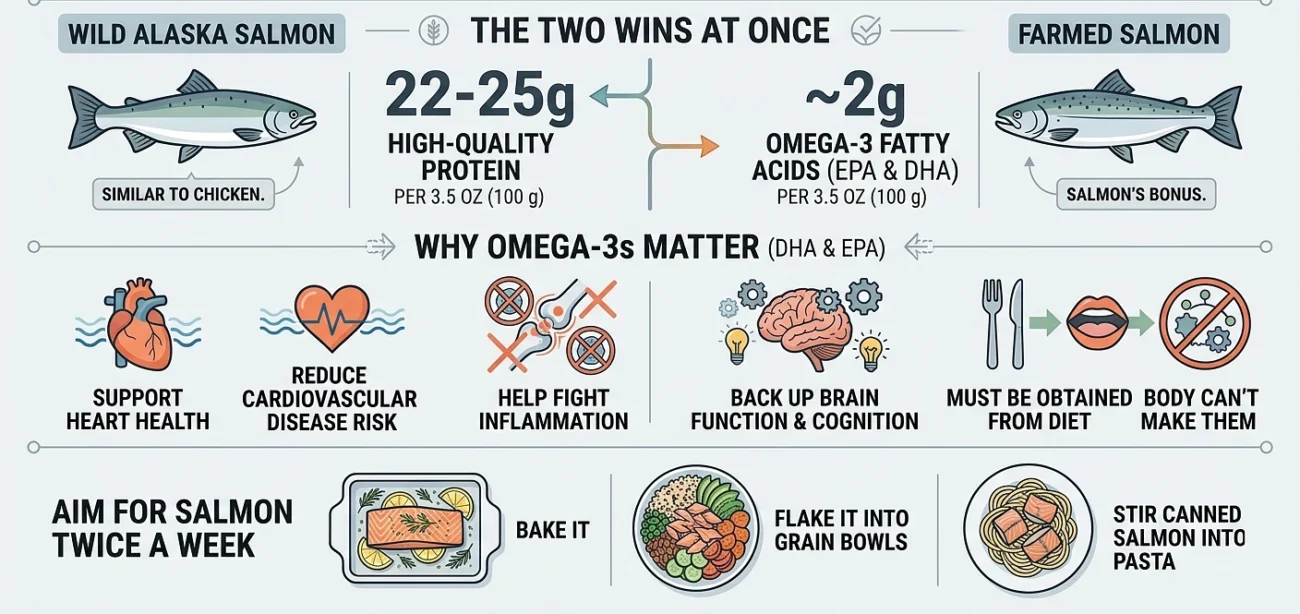 That’s similar to chicken. But salmon adds something chicken can’t: omega-3 fatty acids.
