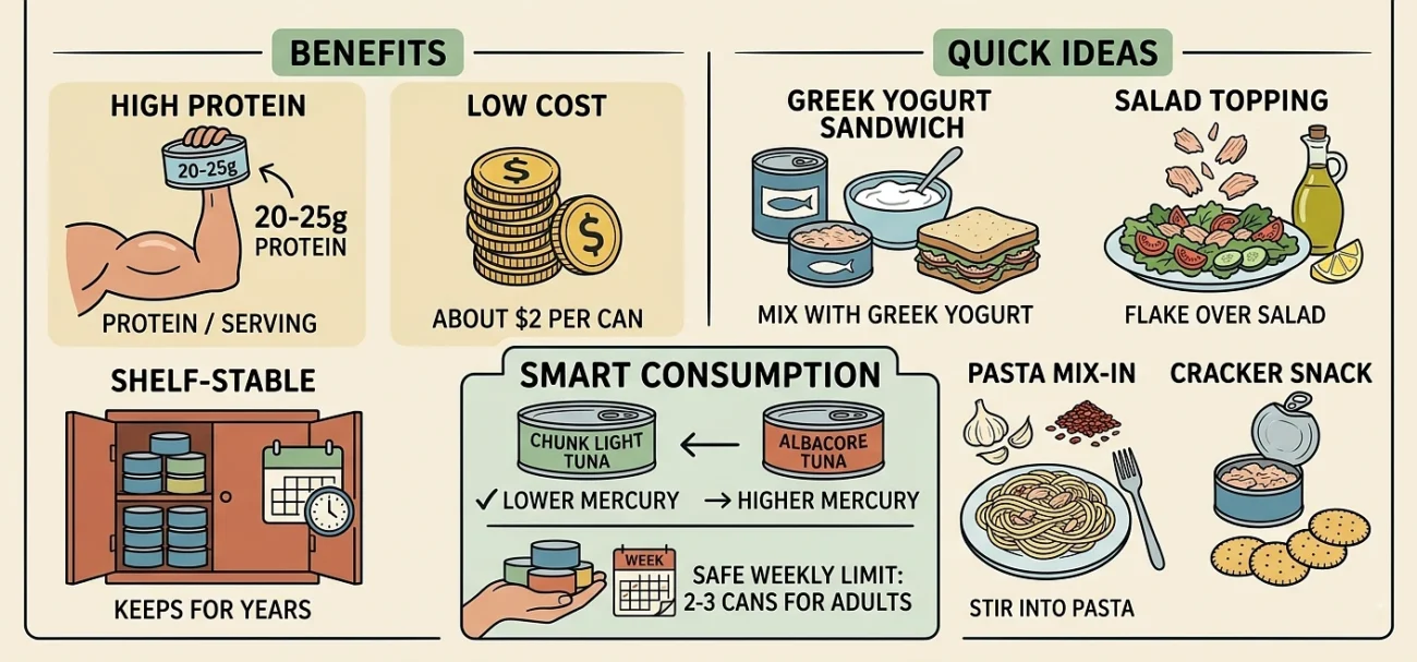 Canned tuna packs roughly 20 to 25 grams of protein per serving, costs about two dollars, and keeps in your cupboard for years.