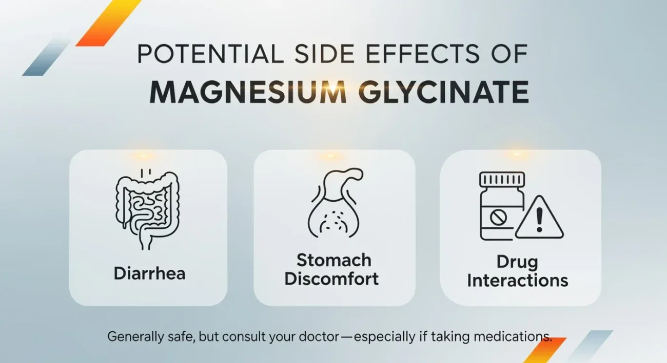 Magnesium glycinate is generally considered safe for most people. However, like any supplement, it can cause side effects, especially if taken in excessive amounts. Some potential side effects include: