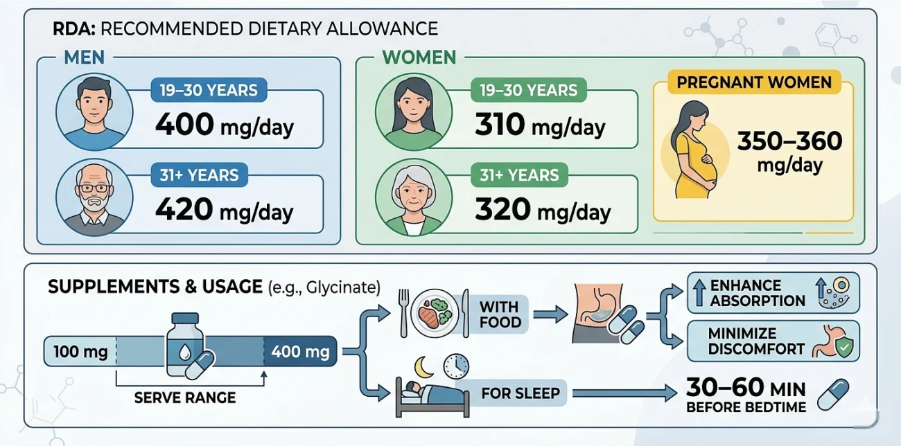 Most supplements provide between 100 mg and 400 mg per serving. It’s best to take magnesium glycinate with food to enhance absorption and minimize any stomach discomfort. For sleep support, many people take it 30–60 minutes before bedtime.