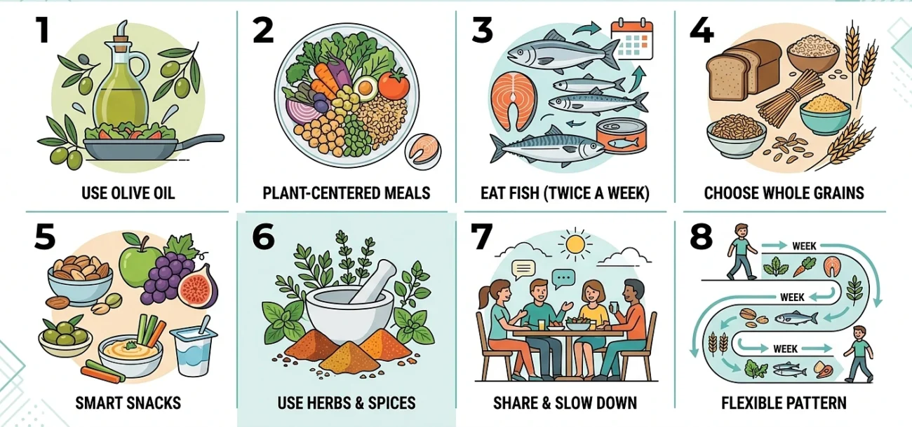 Don’t aim for perfection. The pattern is flexible. A weekly rhythm of mostly plants, regular fish, moderate dairy, and occasional meat is what matters not hitting every box every day.