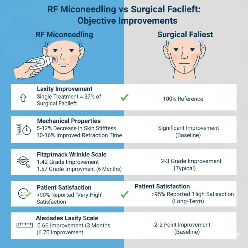 Interesting benchmark: the mean laxity improvement from a single fractional RF treatment measured 37% of what a surgical facelift achieves. Not replacing surgery, but closing a significant gap for patients between “do nothing” and “go under the knife.” Patient satisfaction hit >90% rating “very high” in multiple studies.