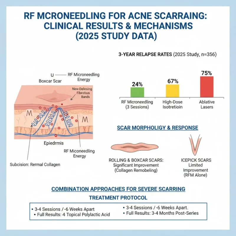 A 2025 study tracking 356 acne scar patients compared three modalities: high-dose isotretinoin therapy, ablative laser series, and fractional RF microneedling. The RF group received just three sessions. After three years of follow-up, relapse rates told the story: 24% for the RF microneedling group versus 67% for isotretinoin and 75% for ablative lasers.