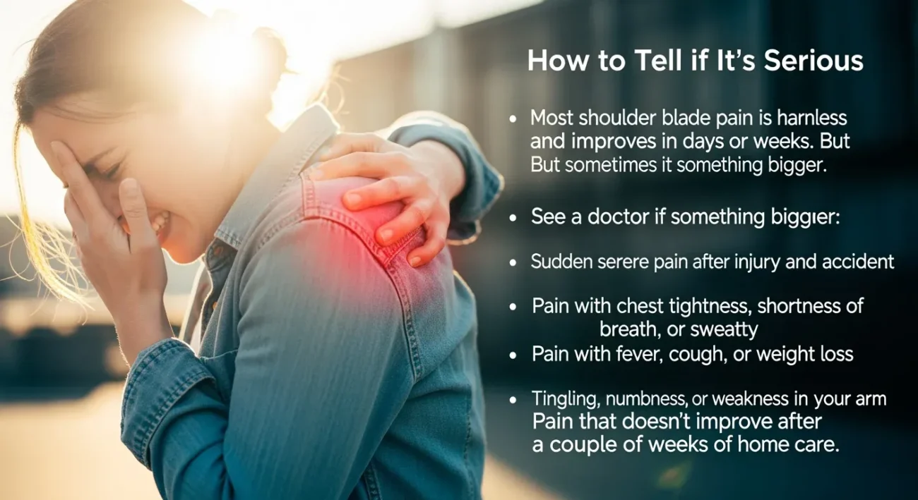 Most shoulder blade pain is harmless and improves in days or weeks. But sometimes it signals something bigger. See a doctor if you notice: