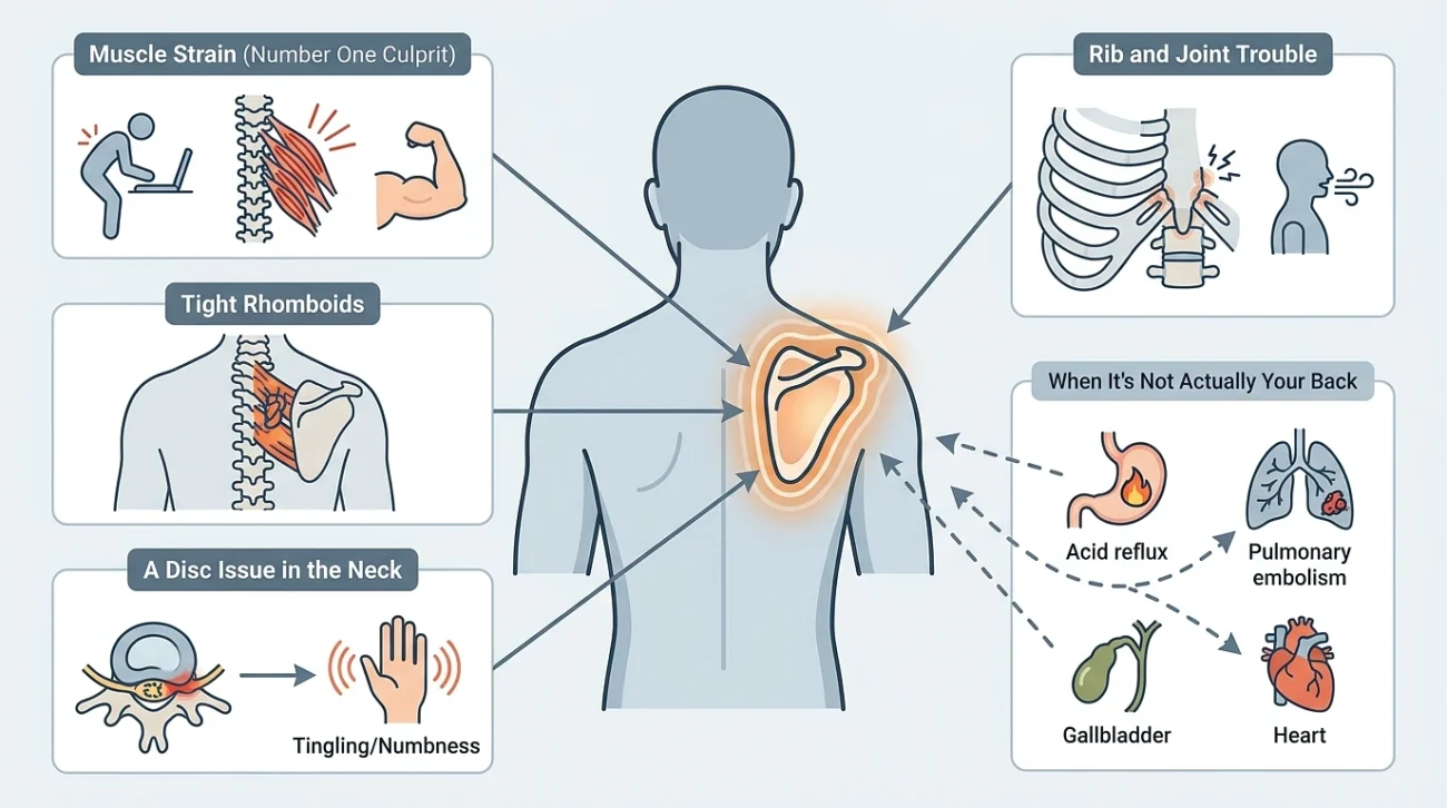 Sometimes the pain has nothing to do with muscles or bones at all. Acid reflux can mimic upper back pain. A pulmonary embolism (a blood clot in the lung) can cause sharp pain between the shoulder blades, usually with shortness of breath. Lung issues, gallbladder trouble, and even a heart attack can refer pain to this area. These are the rarer causes, but they’re the reason you can’t just shrug off shoulder blade pain that comes with weird symptoms.