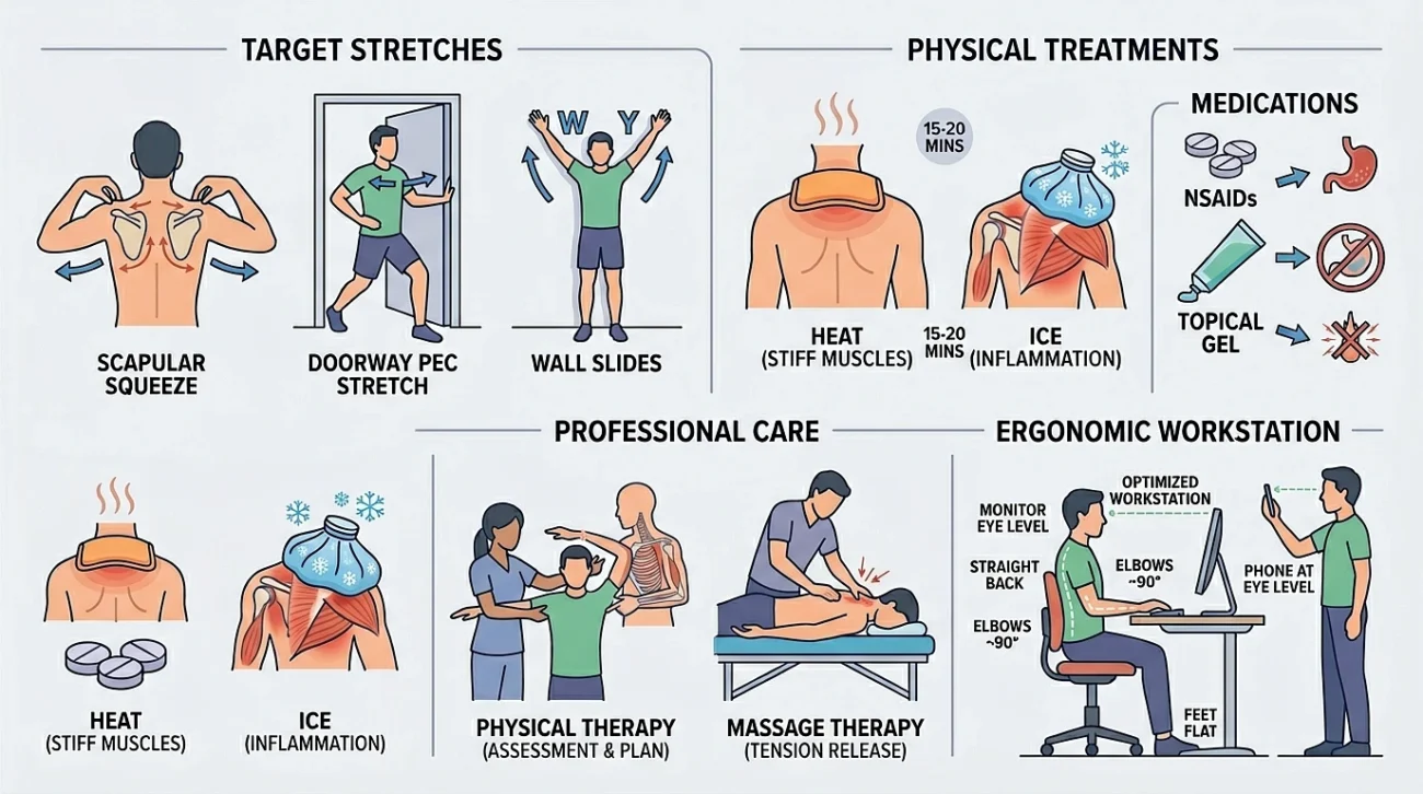This is where most people see real improvement. A few simple moves for the rhomboids and upper trapezius can take the edge off, sometimes within minutes.