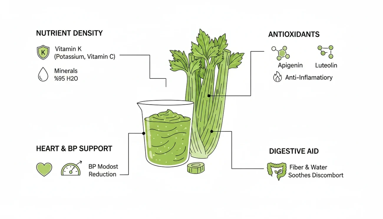 - Heart and blood pressure support. Celery contains a compound called 3-n-butylphthalide (3nB), most concentrated in the seeds, which has been investigated for its effect on blood pressure. A randomized, triple-blind, placebo-controlled crossover trial published in Journal of Food Biochemistry (2022) found that hypertensive patients given 1.34 g of celery seed extract daily for four weeks saw average systolic blood pressure drop from about 141 to 130 mmHg, and diastolic from 92 to 84 mmHg (Shayani Rad et al., 2022, PubMed). A 2024 narrative review in the International Journal of Food Science concluded that the available evidence supports celery’s role in modestly improving blood pressure parameters, primarily through 3-n-butylphthalide and apigenin acting as vasodilators, mild diuretics, and calcium channel blockers (Alobaidi et al., 2024, Wiley Online Library).
