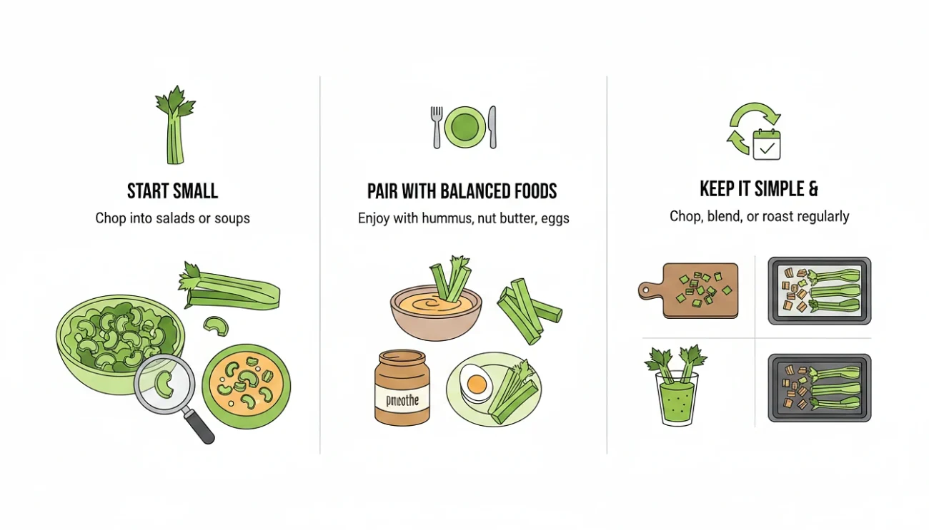 - Start small. If you’re not used to eating celery regularly, begin with a small amount a few stalks chopped into a salad or soup you already make. Your palate adjusts gradually, and you’re more likely to stick with it than if you try to overhaul everything at once.