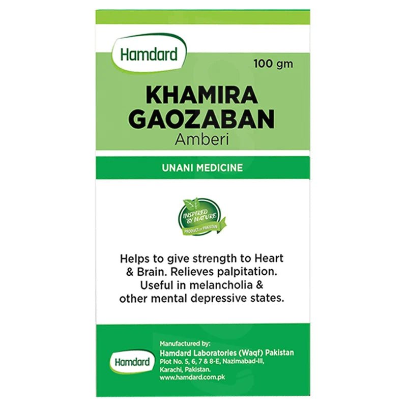 The Hamdard Khamira Gaozaban Amberi is an unani or herbal medicine produced by the Hamdard brand. It has a semi-solid consistency, and contains natural herbs and powdered drugs. Other herbal constituents, including animal and mineral origin products are also present. Hamdard Khamira Gaozaban Amberi helps with heart and blood vessel diseases, brain problems, and gastrointestinal problems. It is beneficial for the liver, respiratory system, stomach, heart, nervous system, and other main body organs. It also works for cough, flu, cold, and catarrh. It also improves sleep, mood, and heart function. It strengthens the immunity system, benefits eyesight, and provides a cooling effect.