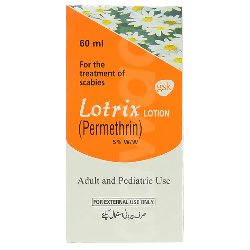 Lotrix lotion is used in the treatment of scabies, a condition characterized by skin infestation by the human itch mite. It can also be used to kill mosquitoes, ticks, flies, and cockroaches. Composed of Permethrin, it is from the pyrethrins group of medicines. The lotion works by paralyzing and then killing the scabies’ eggs.