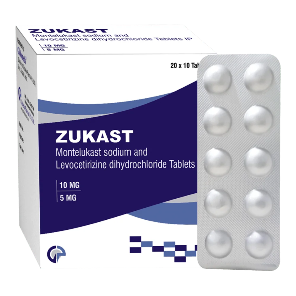 Zukast 10 mg contains Zafirlukast, a leukotriene receptor blocker designed to manage asthma and allergic airway inflammation. Instead of providing instant relief like inhaled bronchodilators, it works in the background by preventing airway tightening and inflammation over time.