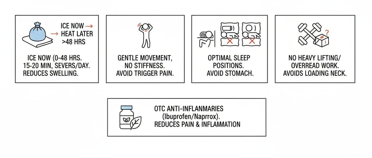 - Ice now, heat later. For the first 48 hours, ice is your friend. Wrap a cold pack in a thin towel and rest it on the base of your neck and upper shoulder for 15 to 20 minutes at a time, several times a day. The cold tames the swelling pressing on the nerve. After two days, switch to heat it loosens the surrounding muscles and pulls fresh blood into the area.
