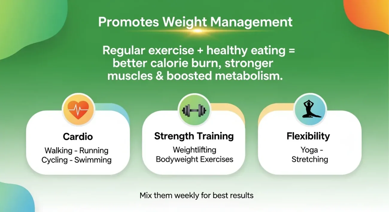 Regular exercise, combined with healthy eating, is essential for maintaining a healthy weight. Exercise helps burn calories, build muscle, and boost metabolism.