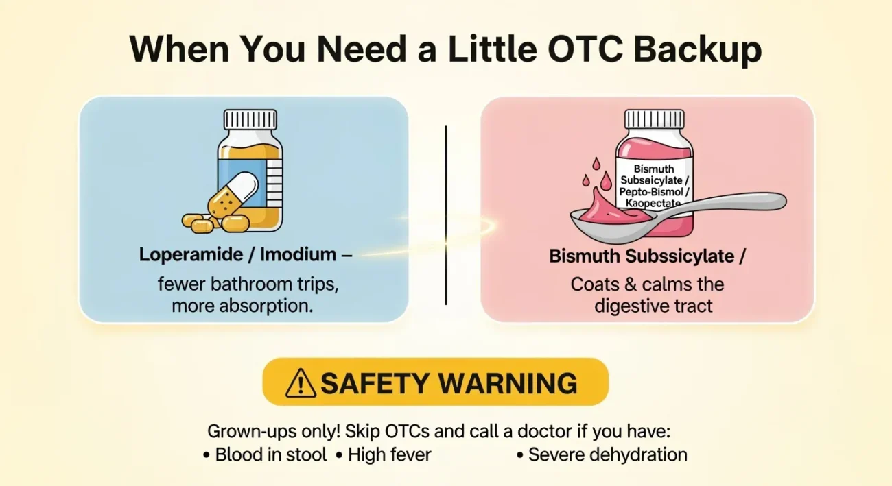 If tummy issues persist, a couple of over‑the‑counter backups can help but they’re not magic bullets.