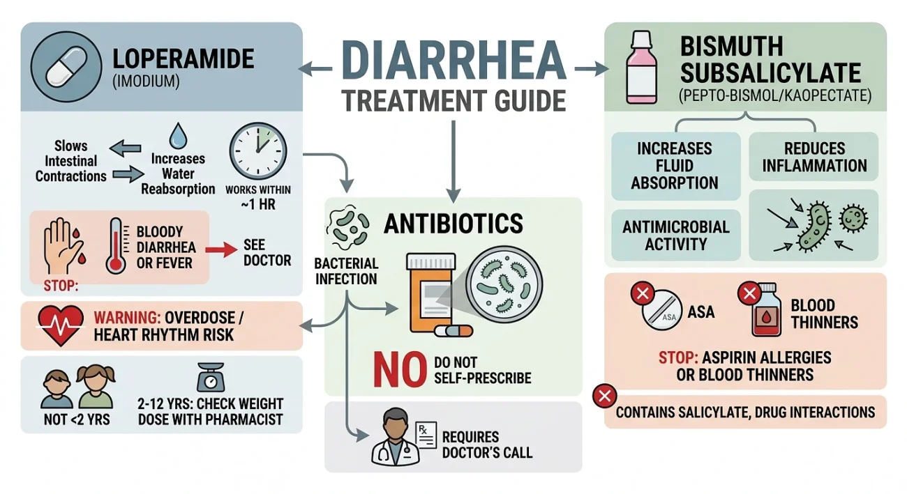 One hard rule: if there’s bloody diarrhea or fever, signs of bacterial or parasitic infection, skip OTC anti-diarrheal medicines entirely and see a doctor.
